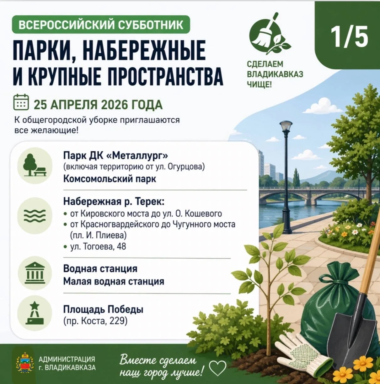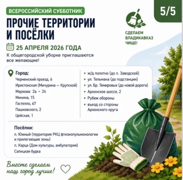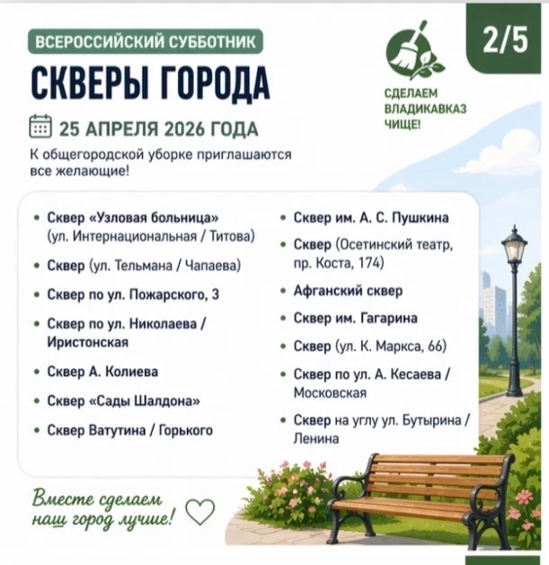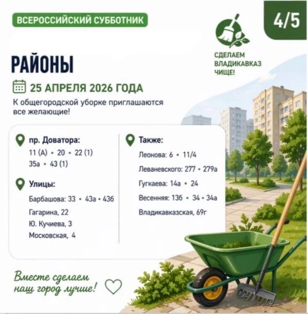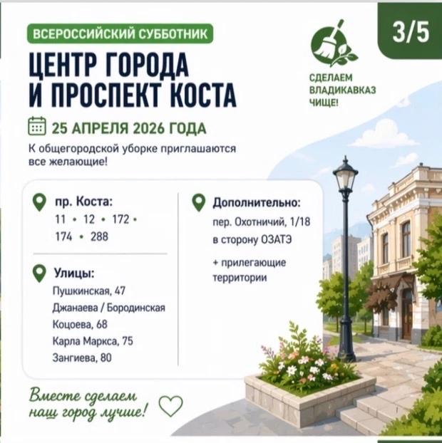 25 апреля 2026 года в столице Северной Осетии пройдёт ежегодный Всероссийский субботник.