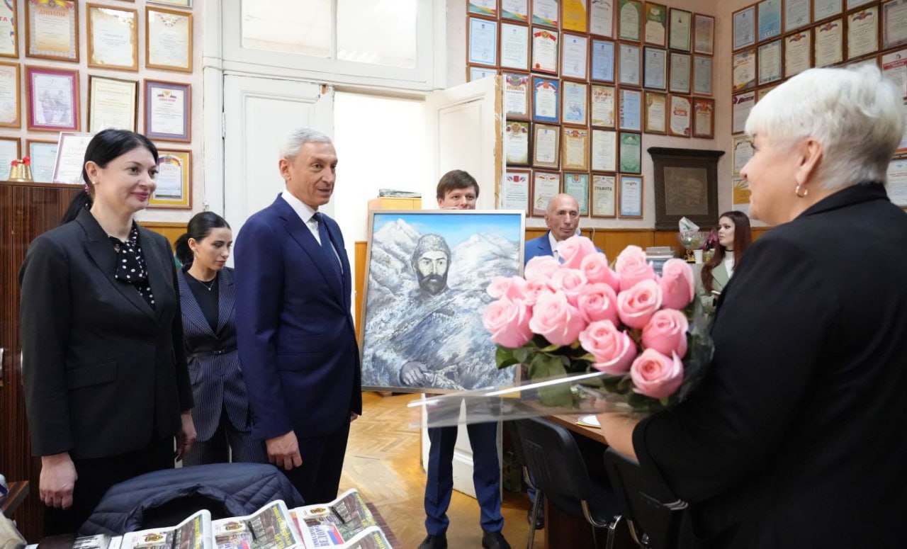 В честь праздника Председатель Правительства преподнес коллективу гимназии подарок – картину с изображением поэта, основоположника осетинского языка и литературы Коста Левановича Хетагурова кисти художника, члена Союза художников России Сергея Филатова.