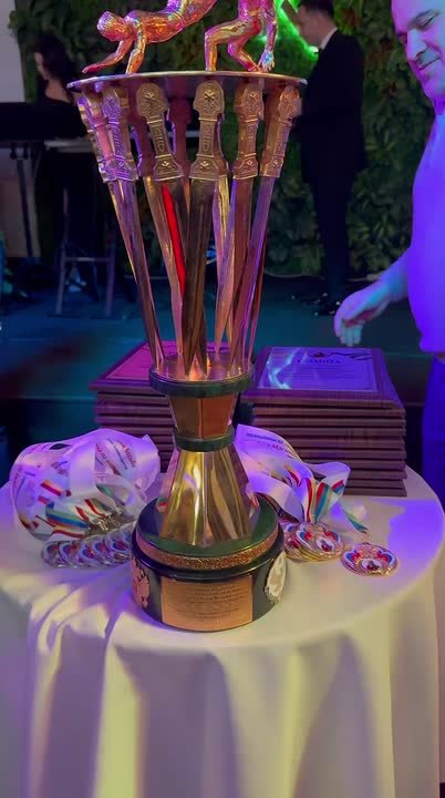 Заветный кубок матчевой встречи осетинских и дагестанских вольников. Кубок вручен легендарному тренеру Казбеку Дедегкаеву.
