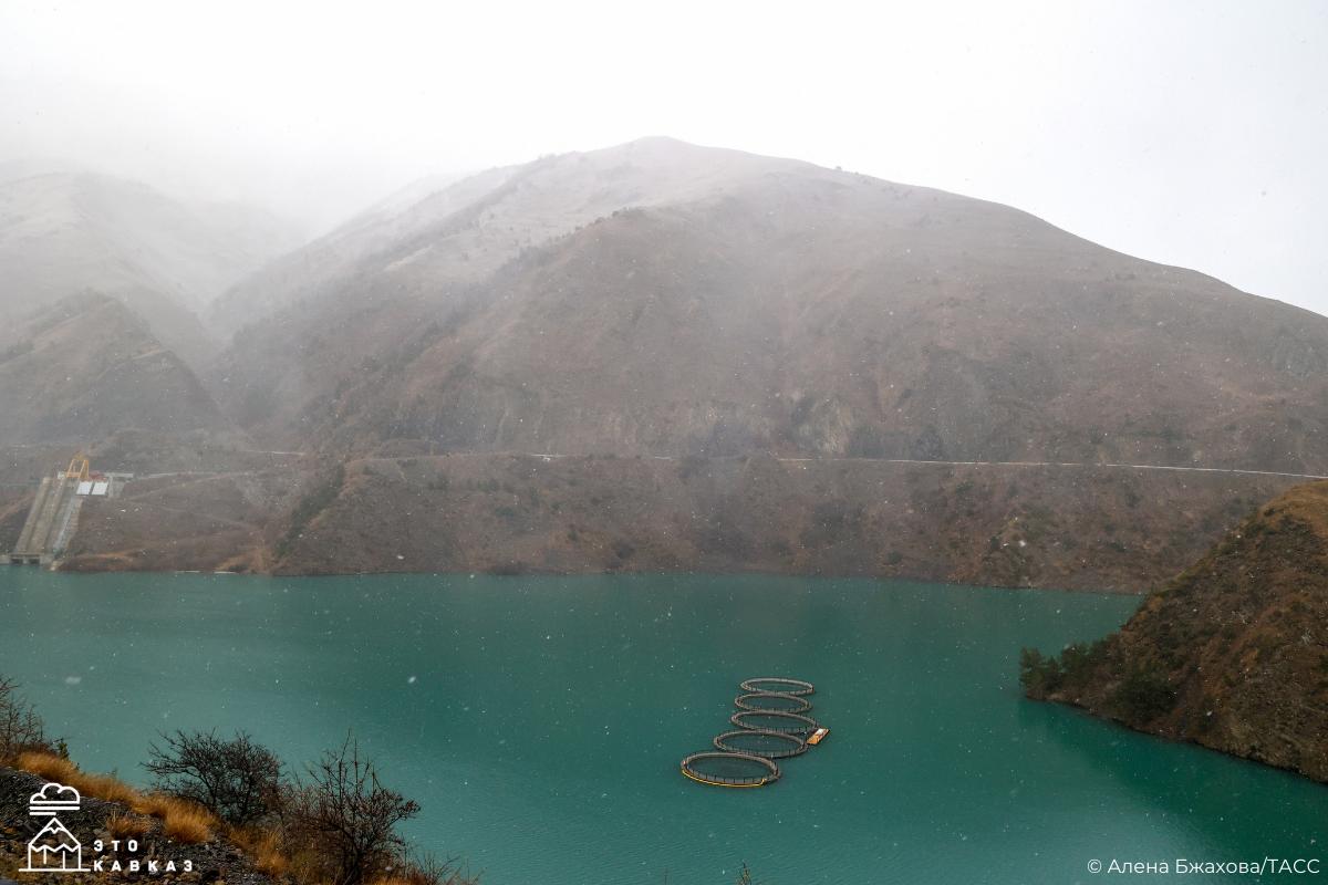 Зимние виды водохранилища Зарамагской ГЭС-1 в Северной Осетии.