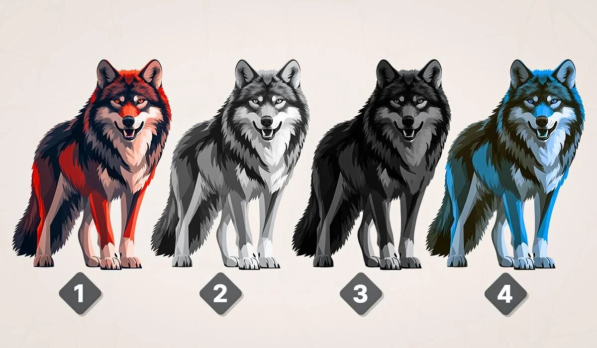 Тест прост: необходимо выбрать один из четырех представленных волков, каждый из которых отличается цветом. Как только выбор будет сделан, можно перейти к интерпретации.