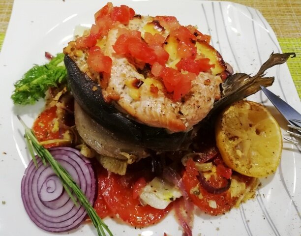 Готовое блюдо подается на стол с добавлением свежевыжатого лимона и зелени. Сочетание горбуши и овощей станет настоящим кулинарным хитом на вашем столе!