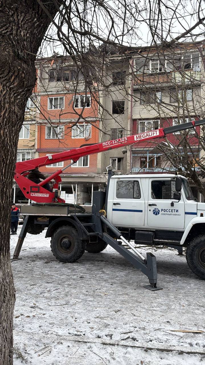 По экстренному распоряжению главы республики Сергея Меняйло, коммунальные службы работают над устранением последствий падения БПЛА. Проводится обследование внутренних инженерных сетей дома и создание теплового контура здания, уборка территории. На месте работает 6 единиц техники и около 100 сотрудников ГУП РПВВ.