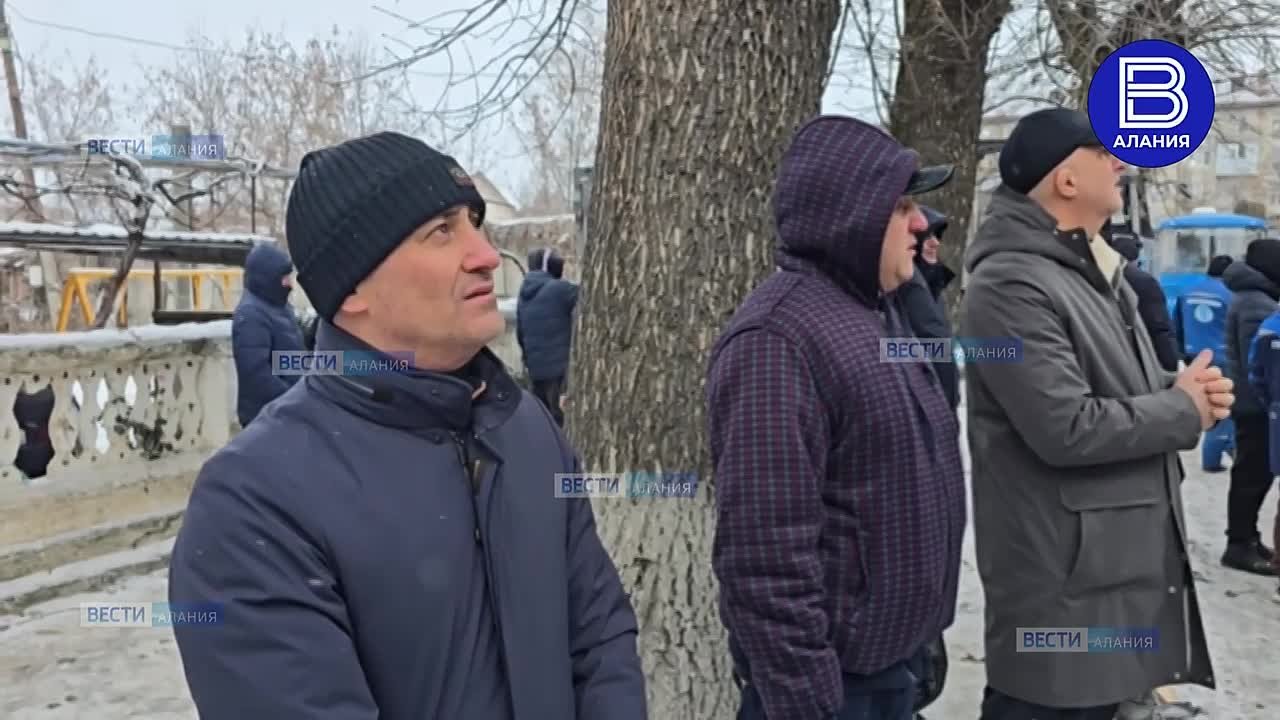 Георгий Атаров около пострадавшего после падения обломков БПЛА дома в Беслане, первый вице-премьер на месте контролирует ход работ.