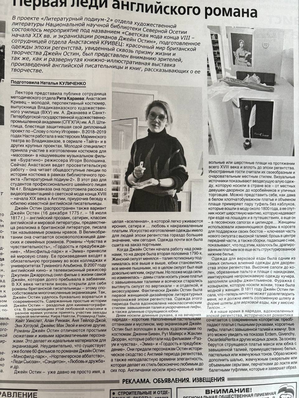 В проекте «Литературный подиум-2» отдела художественной литературы Национальной научной библиотеки Северной Осетии состоялось мероприятие под названием «Светская мода конца VIII – начала ХIХ вв. и экранизации романов Джейн Остин», подготовленное сотрудницей отдела Анастасией КРИВЕЦ: красочный мир британской одежды эпохи регентства, увиденный сквозь призму жизни и творчества Джейн Остин, был представлен вниманию зрителей, так же, как и развернутая книжно-иллюстративная выставка произведений английской писательницы и книг, рассказывающих о ее творчестве.