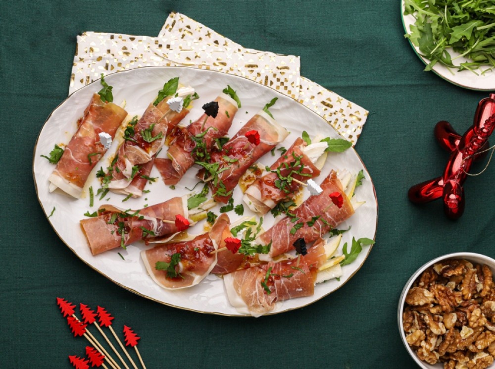 Элегантная закуска, которая почти не требует времени. Груша и козий сыр внутри тонких пластов прошутто создают мягкую сладко-соленую ноту, подчеркивающую праздничную атмосферу.