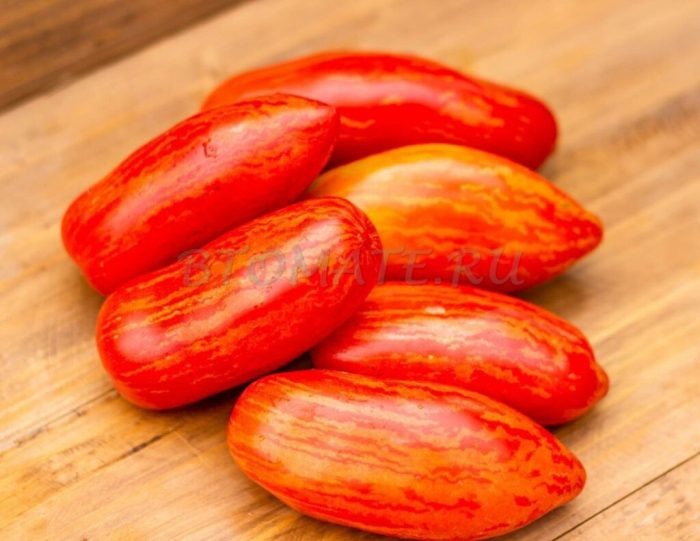 Плоды — маленькие, 50–120 г, с характерной штриховкой и искривлённой формой. Окрас в стадии созревания складывается так, что зелёный фон сменяется тёмно-жёлтыми полосами, переходящими в красный с золотистыми акцентами. Такое сочетание даёт не только декоративную ценность, но и оригинальный вкус, который хорошо подходит для свежих блюд и салатов.