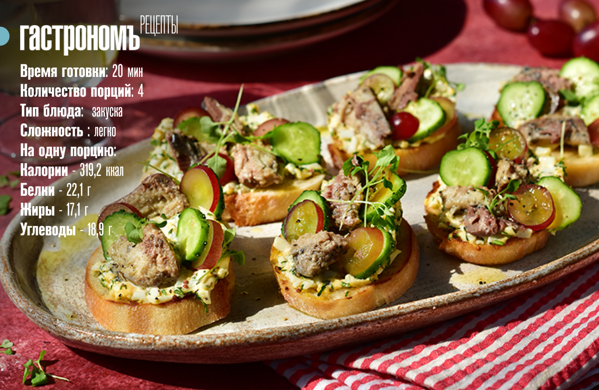 5. На поджаренную сторону ломтиков выложить яичный салат, сверху разместить кусочки сайры. Вертикально вставить кружочки винограда и огурца это придаст брускеттам свежую яркость и эффектную подачу. Подача сразу после сборки, чтобы хлеб сохранил хруст.