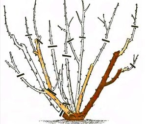 - Удаление: Сначала убираются поврежденные и старые ветки, направленные внутрь куста.