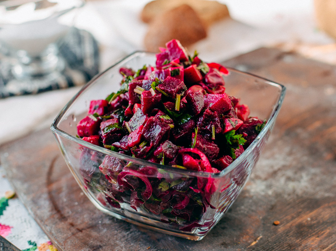 Затем добавляется мелко нарезанная зелень сельдерея и петрушки. Томить на небольшом огне около 15 минут, пока лук не станет мягким и почти прозрачным. Можно добавить немного сахара для карамелизации, это сделает его еще более аппетитным. Свеклу необходимо очистить и нарезать тонкими брусками, а затем добавить к готовому луку. Отдельно обжарить семечки до золотистого цвета и добавить их в салат.