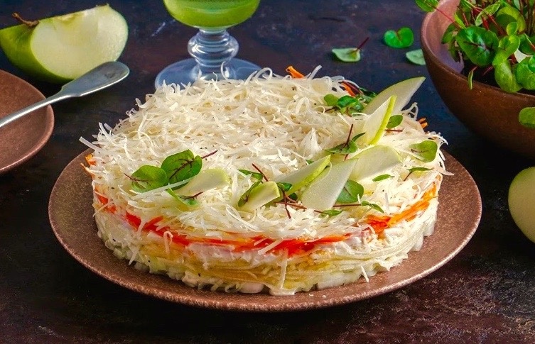 Начните с того, что мелко нашинкуйте капусту и помните ее с солью. После этого добавьте натертые яблоки, нарезанный лук и другие ингредиенты по очереди, перемешивая с майонезом.