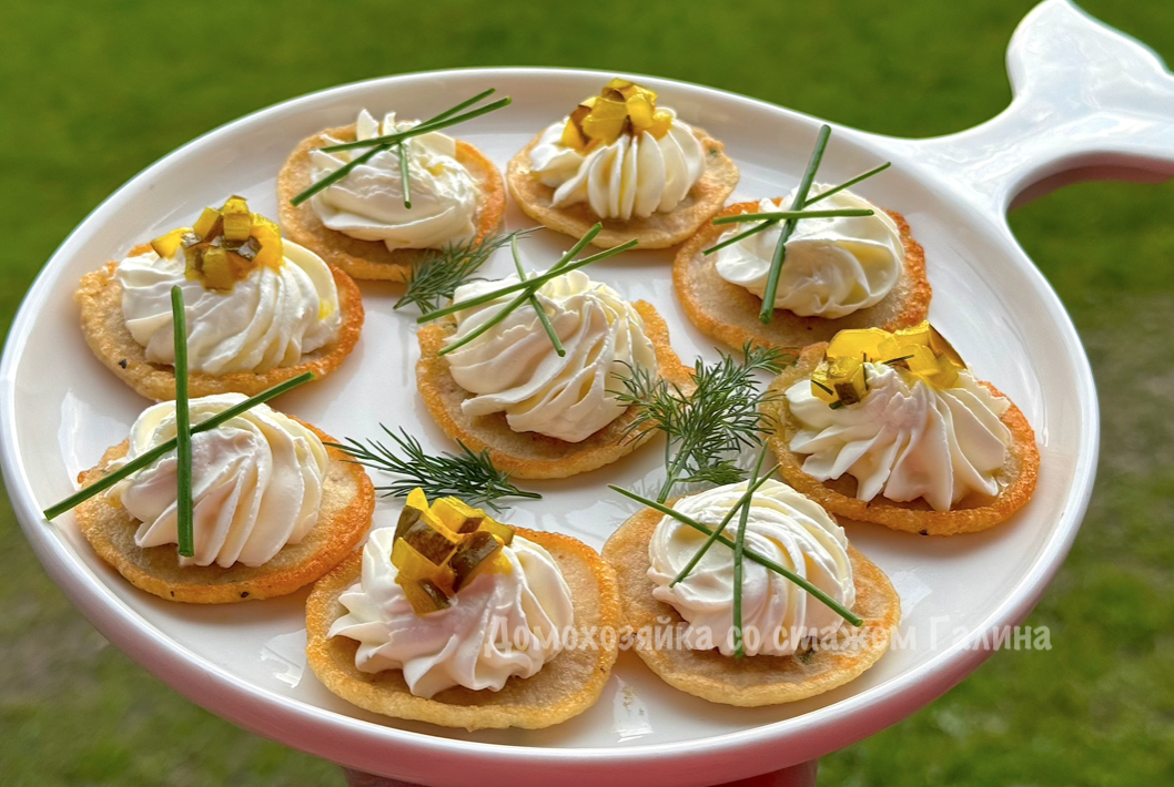 Творожный сыр помещается в кулинарный мешок с насадкой, с помощью которого аккуратно отсаживается на каждую оладью. Завершить стоит добавлением огуречного релиша и немного шнитт-лука. Важно: не перегружайте закуску слишком большим количеством украшений, чтобы вкус икры оставался ярким.
