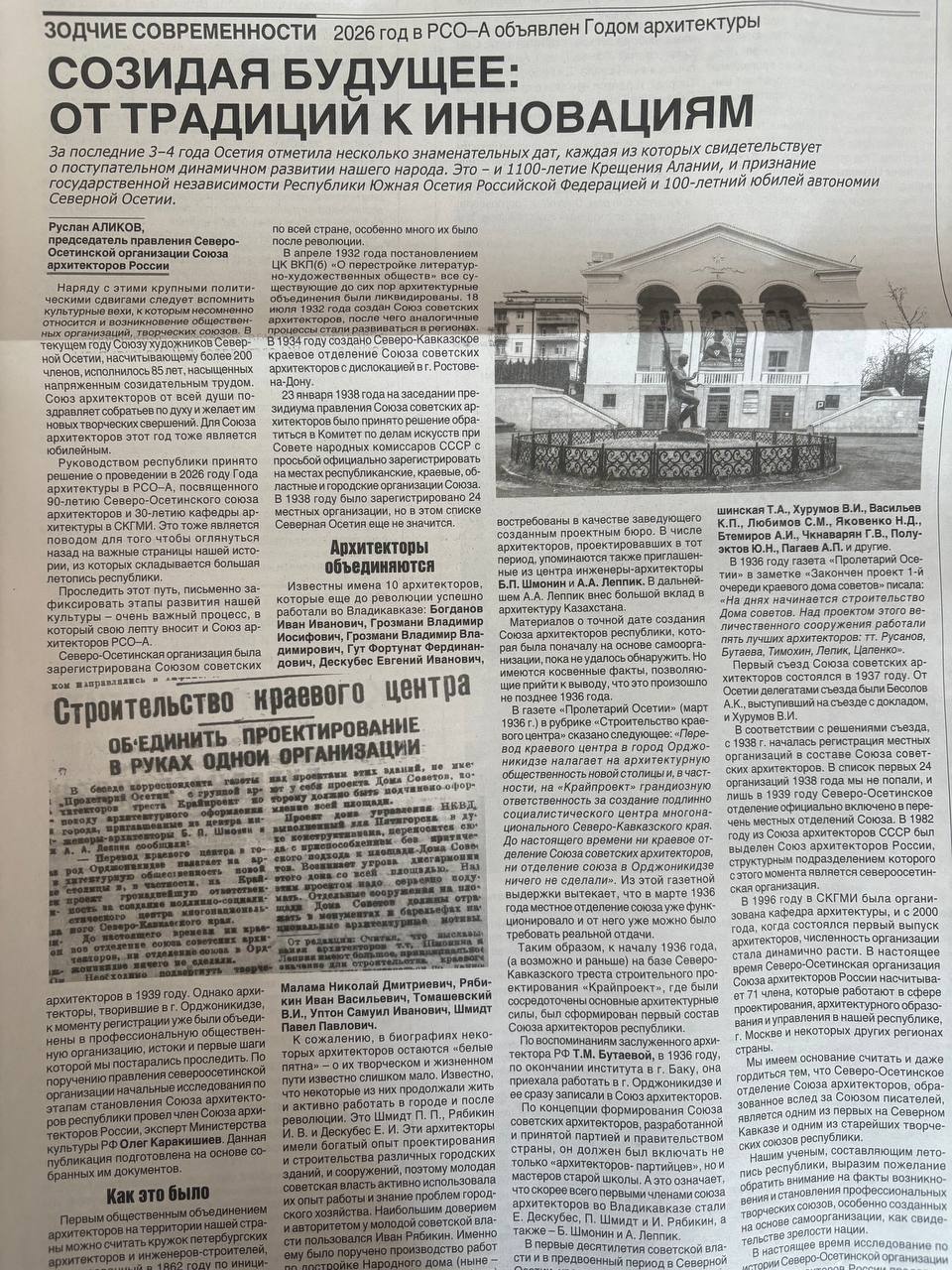 Руководством республики принято решение о проведении в 2026 году Года архитектуры в РСО–А, посвященного 90-летию Северо-Осетинского союза архитекторов и 30-летию кафедры архитектуры в СКГМИ. Это тоже является поводом для того чтобы оглянуться назад на важные страницы нашей истории, из которых складывается большая летопись республики.