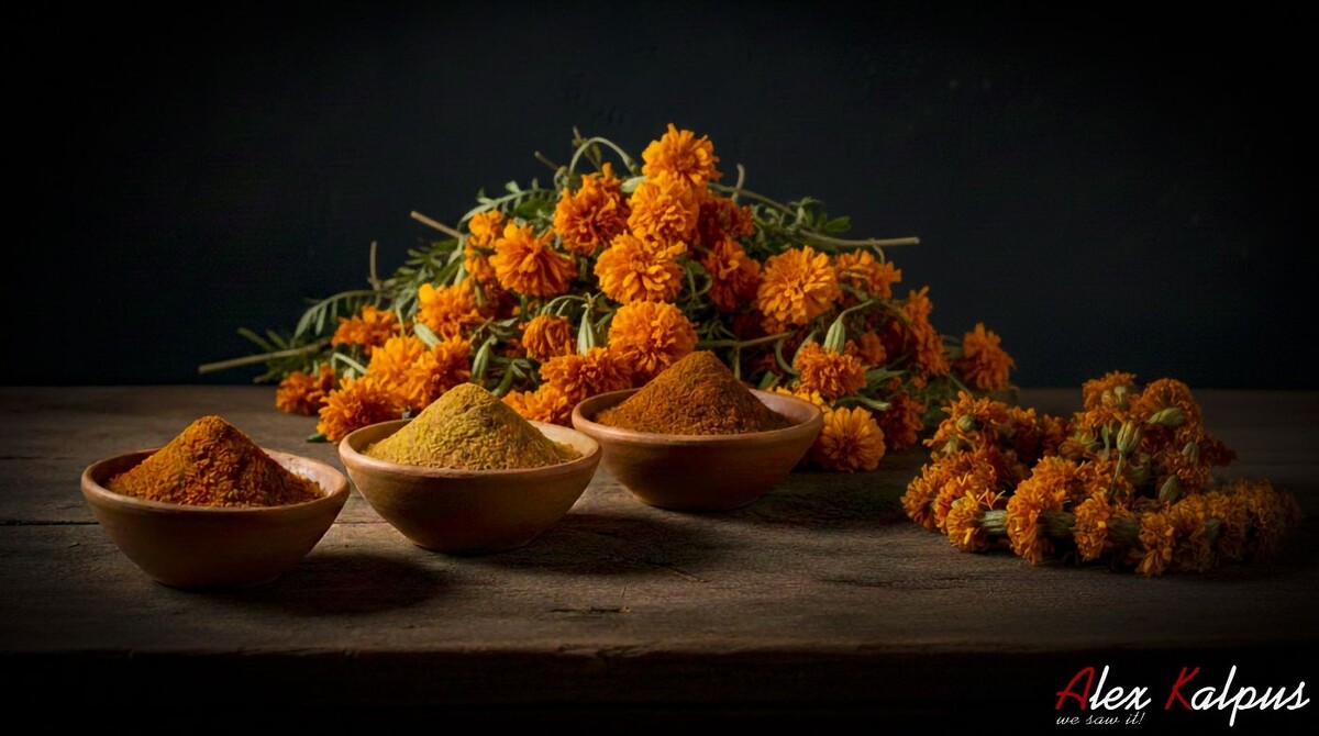 - Tagetes erecta (бархатцы прямостоячие): содержат высокий уровень каротиноидов, обеспечивая яркий цвет.