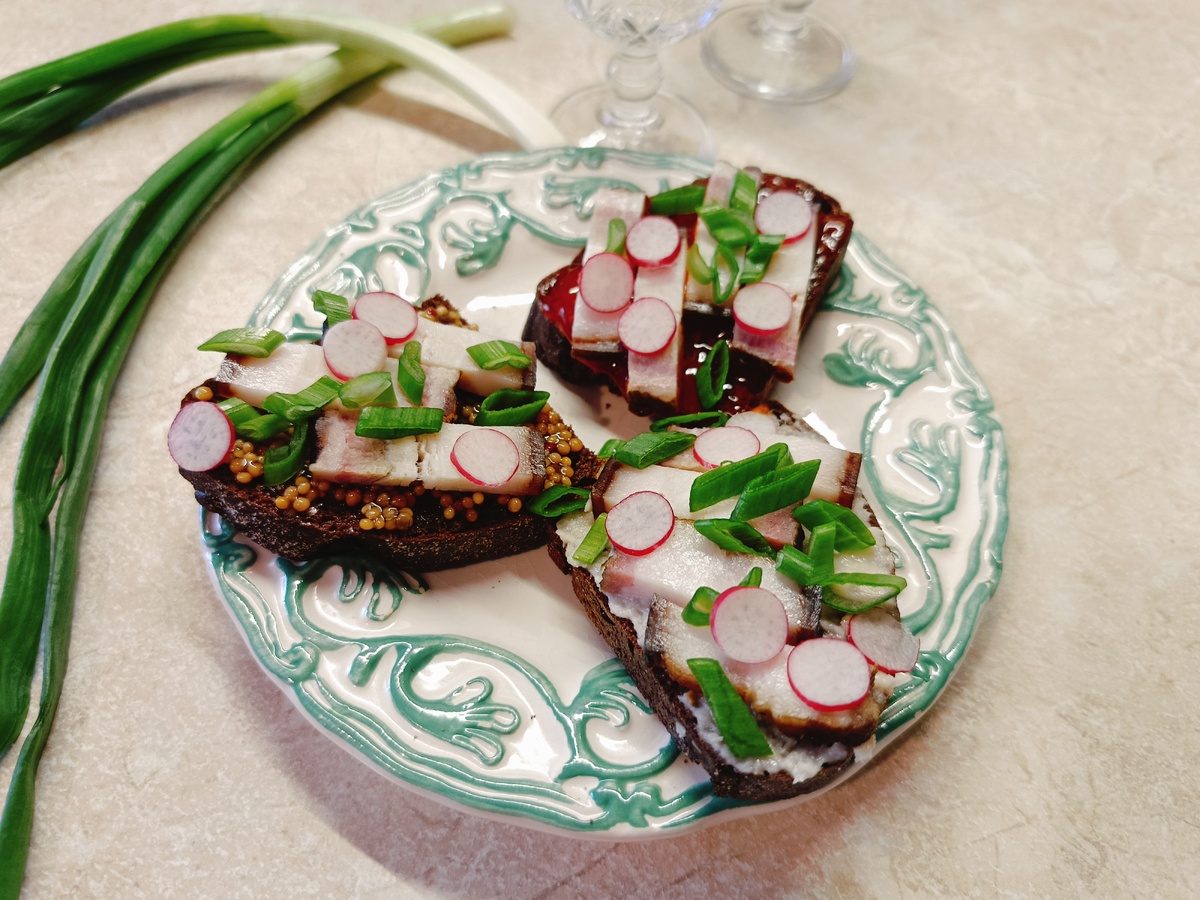 Каждый ломтик ржаного хлеба покрывается различными приправами: хрен, горчица и острый соус — это настоящий взрыв вкуса! Затем сверху аккуратно выкладываются приготовленные кусочки сала, добавляя на бутерброды сочность и насыщенность.