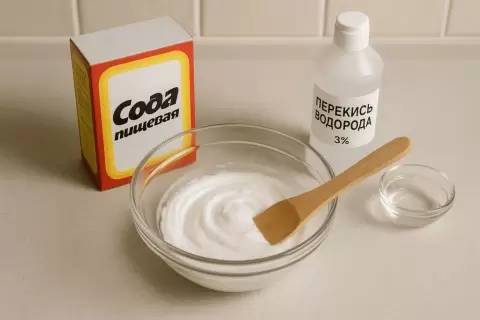 - Приготовление очищающей пасты: В неметаллической посуде смешивают пищевую соду и перекись водорода, чтобы получить пасту в консистенции густой зубной пасты. Перекись выступает как отбеливатель, а сода — как мягкий абразив.