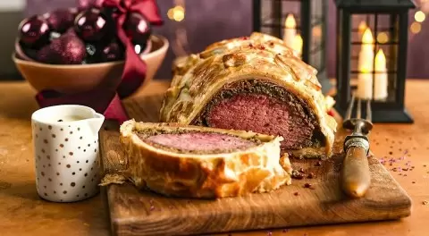 - Обмотать вырезку в прошутто и грибной паштет, затем завернуть в слоеное тесто и выпекать до достижения аппетитной корочки.