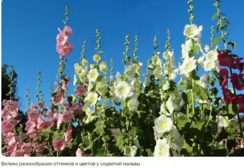 Существует множество сортов мальвы: от высокорослых до невысоких, с простыми и махровыми цветками. Среди сортов с простыми цветками можно отметить: