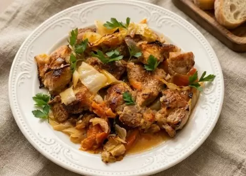 В керамической форме на дно укладывается слой капусты, на который равномерно распределяется свинина и овощи. Всё закрывается верхним слоем пергамента, создавая конверт, который позволит блюду запекаться в собственном соку, оставаясь сочным и ароматным.