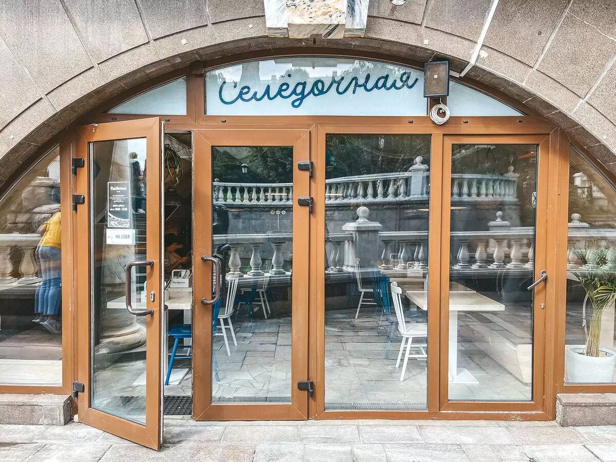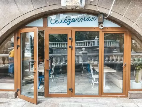 'Селёдочная' располагает двумя уютными залами с отдельными входами: одним с улицы, а другим через ТЦ 'Охотный ряд'. Интерьер воссоздает атмосферу портового городка, где рыболовные сети свисают с потолка, а деревянные столики приглашают гостей к обедам под открытым небом.