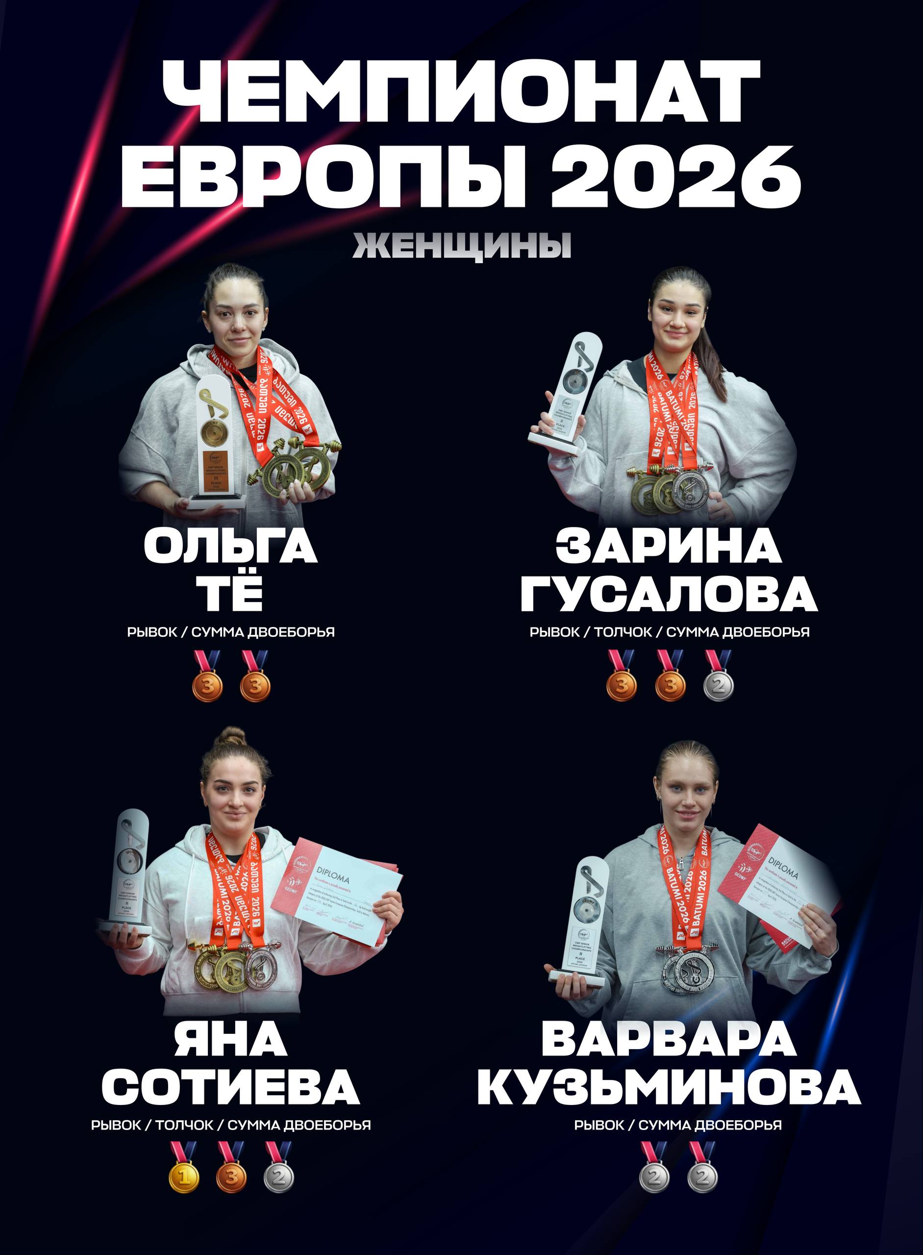 Позавчера прошли заключительные выступления наших девушек на чемпионате Европы в Батуми. За 6 дней на грузинском помосте выступили 8 наших спортсменок и завоевали 10 медалей: 1 золотую, 4 серебряных и 5 бронзовых!